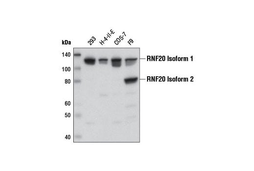 RNF20 (D6E10) Rabbit Monoclonal Antibody recognizes endogenous levels of total RNF20 protein. This antibody recognizes a second band at 80 kDa in mouse lysates, corresponding to mouse RNF20 isoform 2. This antibody does not cross-react with RNF40 protein.