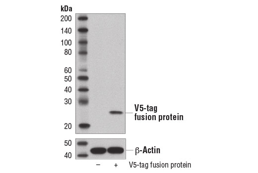 V5-Tag (D3H8Q) Rabbit Monoclonal Antibody detects recombinant proteins containing the V5 epitope tag. This antibody recognizes the V5-tag fused to either the amino or carboxy terminus of targeted proteins in transfected cells. This antibody detects exogenously expressed V5-tagged proteins in cells expressed under a CMV promoter. Expression under other promoters has not been evaluated.