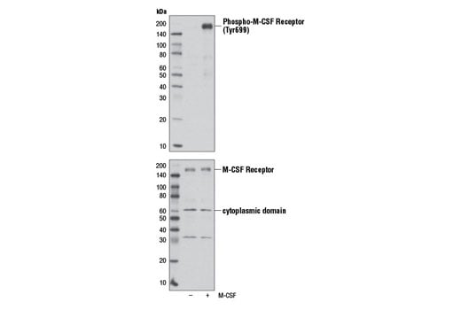 Phosphorylation of M-CSF receptor on Tyr669 was identified at Cell Signaling Technology (CST) using PhosphoScan®, a CST® LC-MS/MS platform for phosphorylation site discovery, as well as in another publication (10). Autophosphorylation at Tyr699 in the kinase insert (KI) domain appears to provide a binding site for the Grb2 adaptor protein (9).