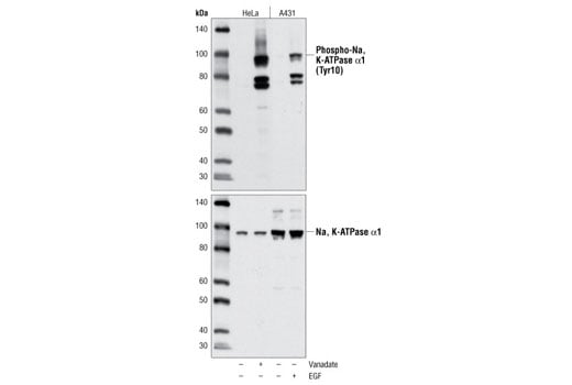 Phospho-Na,K-ATPase alpha1 (Tyr10) Antibody recognizes endogenous levels of Na,K-ATPase α1 only when phosphorylated at Tyr10. This antibody cross-reacts with an induced 75-80 kDa doublet of unknown origin.
