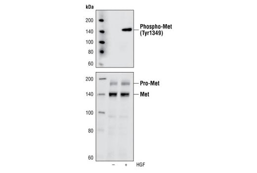 Phospho-Met (Tyr1349) (130H2) Rabbit Monoclonal Antibody detects endogenous levels of Met only when phosphorylated at tyrosine 1349. This antibody may cross-react with other activated protein tyrosine kinases.