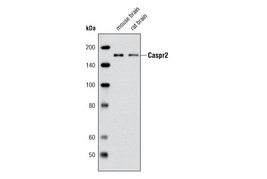 Caspr2 protein localizes to juxtaparanodal regions of myelinated axons where it forms a cis-complex with the immunoglobulin-like cell adhesion molecule TAG-1. Caspr2 also binds to Shaker K+ channels Kv1.1, Kv1.2, and their Kvβ2 subunit. A PDZ domain at the Caspr2 carboxy terminus mediates the Caspr2-K+ channel association. Caspr2 is required for proper K+ channel localization, as Caspr2 deletion causes the redistribution of channels along the internodes (1-3). Furthermore, Caspr2 binds to protein 4.1B and connects the protein complex to the axonal cytoskeleton (4). Mutations in the Caspr2 gene have been linked to focal epilepsy, cortical dysplasia and Gilles de la Tourette syndrome (5,6).