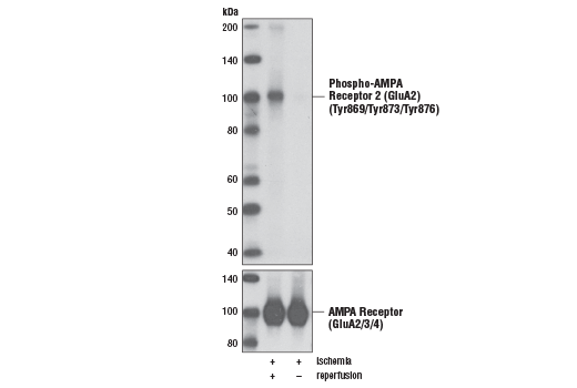Src family tyrosine kinases phosphorylate the GluR 2 subunit of AMPA receptors at Tyr876, which increases the interaction with GRIP1/2 but not PICK1. In addition, Tyr876 is important for AMPA- and NMDA-induced GluR 2 internalization (3).The phosphorylation sites at Tyr869, Tyr873 and Tyr876 were identified at Cell Signaling Technology (CST) using PhosphoScan®, CST's MS/MS platform for phosphorylation site discovery. Phosphorylation of GluR2 at Tyr869, Tyr873 and Tyr876 was observed in extracts isolated from ischemic rat brain. These sites were independently found in a large-scale identification of tyrosine phosphorylation sites from murine brain (4).