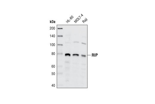 RIP Antibody detects endogenous levels of RIP (RIP1) protein. No cross-reactivity was detected with other family members. This antibody also detects a carboxy-terminal fragment of RIP (45 kDa) produced by caspase-8 dependent cleavage.