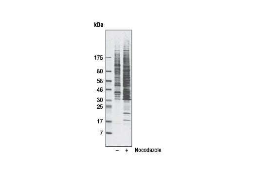 Polo-like kinases (PLKs) are Ser/Thr protein kinases that play an essential role during the cell cycle. At least four PLKs exist in mammalian cells: PLK1, PLK2, PLK3, and PLK4 (1). PLKs have a highly conserved amino-terminal kinase domain and a relatively divergent carboxy-terminal domain called the Polo-box domain (PBD). Of the four PLKs, PLK1 is the best characterized (2). PLK1 functions as a key regulator of mitotic events by phosphorylating substrate proteins on centrosomes, kinetochores, the mitotic spindle, and the midbody, and is crucial for proper progression through multiple stages of mitosis (2-4). The PBDs of PLK1 function as a phospho-Ser/Thr-binding module, recognizing the optimal recognition sequence motif Ser-(pSer/pThr)-(Pro/X) (5). Binding of phosphopeptides containing the Ser-(pSer/pThr)-(Pro/X) motif by the PBD in PLK1 relieves its inhibitory function on kinase activity (6). Ser-(pSer/pThr)-Pro peptides are phosphorylated by proline-directed kinases such as cyclin dependent kinases (CDKs). These findings imply that priming phosphorylations on substrates or docking proteins by other mitotic kinases such as CDKs may target PLK1 to its substrates and simultaneously activate its kinase activity. Phospho-PLK Binding Motif (ST*P) (D73F6) Rabbit mAb is a useful tool to study PLK1 binding proteins and PLK1 substrates.