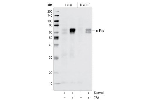 c-Fos (9F6) Rabbit Monoclonal Antibody (BSA and Azide Free) detects endogenous levels of total c-Fos protein. This antibody does not cross-react with other Fos proteins, including FosB, FRA1 and FRA2. This antibody non-specifically stains fixed frozen mouse spleen and liver by immunofluorescence.