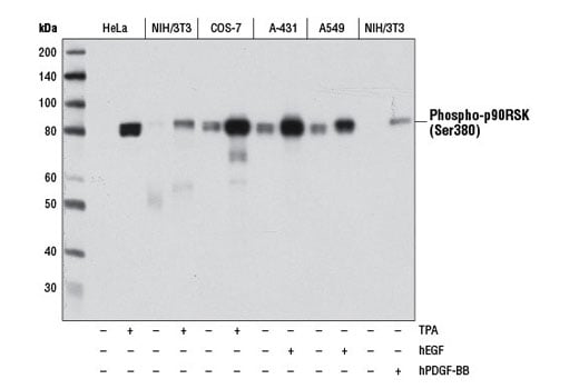 Upon mitogenic stimulation, p44/42 ERK1/2 and ERK5 MAP kinases cooperatively phosphorylate p90RSK Thr573 (p90RSK1 numbering) located within the C-terminal kinase domain and Thr359/Ser363 in the linker region between the two kinase domains (3). Phosphorylation of Thr573 within the activation loop of the p90RSK C-terminal kinase domain promotes activation and directs phosphorylation of Ser380 within the hydrophobic stretch of the linker region (4,5). The phosphorylated p90RSK Ser380 acts as a docking site for the constitutively active Ser/Thr kinase PDK1, which in turn phosphorylates Ser221 within the N-terminal kinase domain activation loop, resulting in full enzymatic activation of the p90RSK (6). Antibodies against these phosphorylation sites are useful for understanding the kinetics and regulation of p90RSK activation.For more information regarding the phospho-regulatory sites within each RSK isoform, including more information regarding the seminal studies demonstrating the complex phosphorylation cascades involved, please see the references herein and PhosphoSitePlus® (www.phosphosite.org).