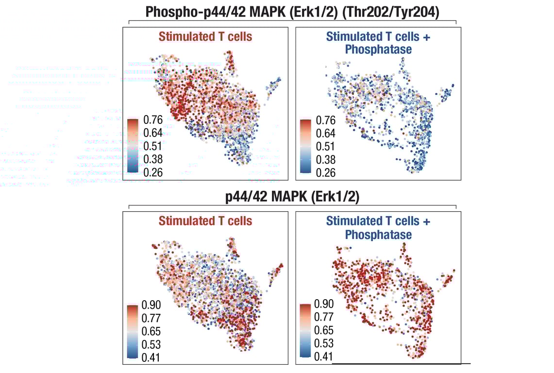Phospho-p44/42 MAPK (Erk1/2) (Thr202/Tyr204) (197G2) Rabbit Monoclonal Antibody (InTraSeq™ 3' Conjugate 3023) detects endogenous levels of p44 and p42 MAP Kinase (Erk1 and Erk2) when dually phosphorylated at Thr202 and Tyr204 of Erk1 (Thr185 and Tyr187 of Erk2), and singly phosphorylated at Tyr204. This antibody conjugate does not cross-react with the corresponding phosphorylated residues of either JNK/SAPK or p38 MAP kinase.
