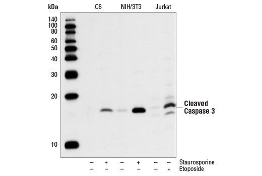 Cleaved Caspase-3 (Asp175) (5A1E) Rabbit Monoclonal Antibody (BSA and Azide Free) detects endogenous levels of the large fragment (17/19 kDa) of activated caspase-3 resulting from cleavage adjacent to Asp175. This antibody does not recognize full length caspase-3 or other cleaved caspases. Non-specific labeling may be observed by immunofluorescence in specific sub-types of healthy cells in fixed-frozen tissues (e.g. pancreatic alpha-cells). Cytoplasmic background may be observed in human and monkey samples.