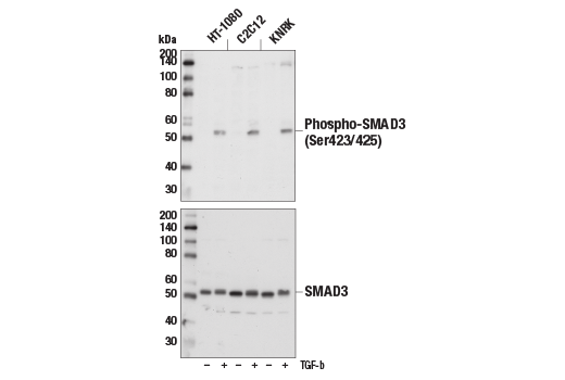 Phospho-SMAD3 (Ser423/425) (C25A9) Rabbit Monoclonal Antibody detects endogenous levels of SMAD3 when phosphorylated at Ser423/425. This antibody does not cross-react with other family members.