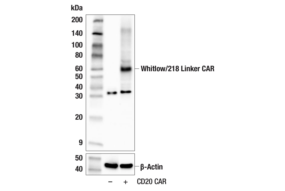 Whitlow/218 Linker (F2G3S) Rabbit mAb (BSA and Azide Free) recognizes exogenously expressed levels of scFv-based CARs containing a Whitlow/218 linker. This antibody cross-reacts with a protein of unknown identity at approximately 35 kDa in Jurkat cell extracts.