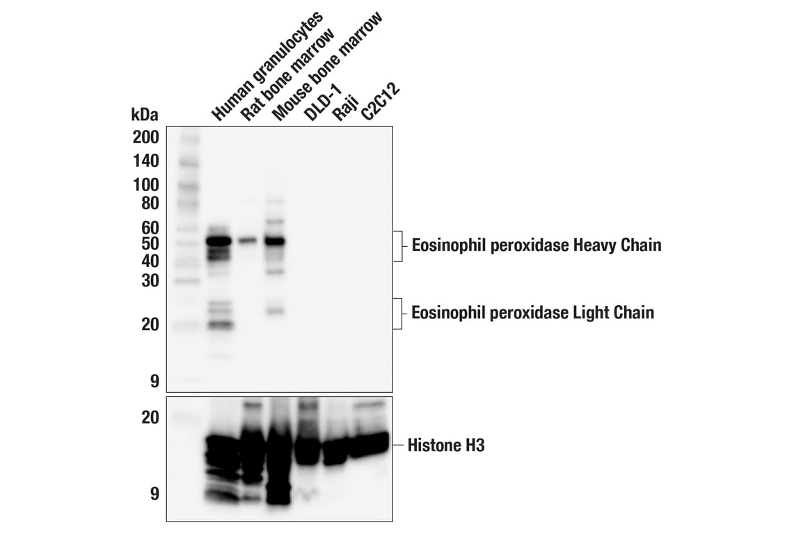 Eosinophil peroxidase (F4O7J) Rabbit mAb (BSA and Azide Free) recognizes endogenous levels of total Eosinophil peroxidase protein. This antibody recognizes the full-length precursor, heavy chain, and light chain subunits of human Eosinophil peroxidase protein. This antibody is not recommended for immunohistochemical analysis of mouse tissues.